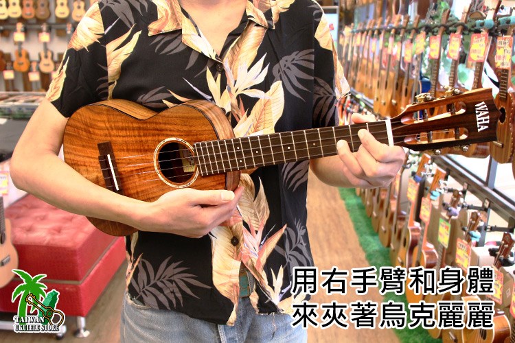 1.用右手臂和身體來夾著烏克麗麗,這個動作不宜太過用力,以免手腕無法輕鬆擺動彈奏。