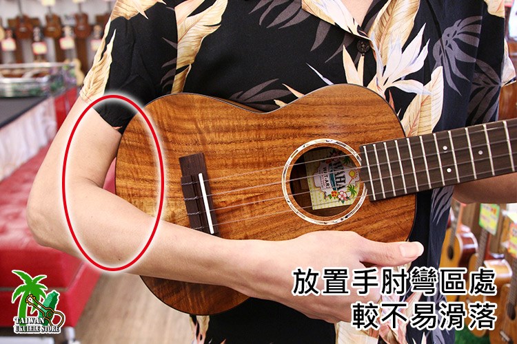 2.將烏克麗麗放置在手肘彎區的部位來固定較不易滑落。