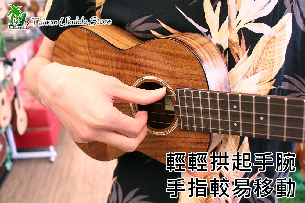 7.拇指放置在琴頸時為支點,並且在其餘四隻手指的中心點,讓手指可以觸碰到所有琴弦,移動時也較為流暢。